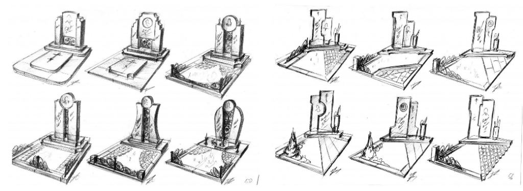 - Joonistamine käest. Visandi saab paberile käsitsi joonistada. See võib olla lihtne visand või üksikasjalik joonis, mis näitab kõiki kujunduselemente, nagu hauakivi kuju, pealdised, pildid ja dekoratiivsed elemendid.